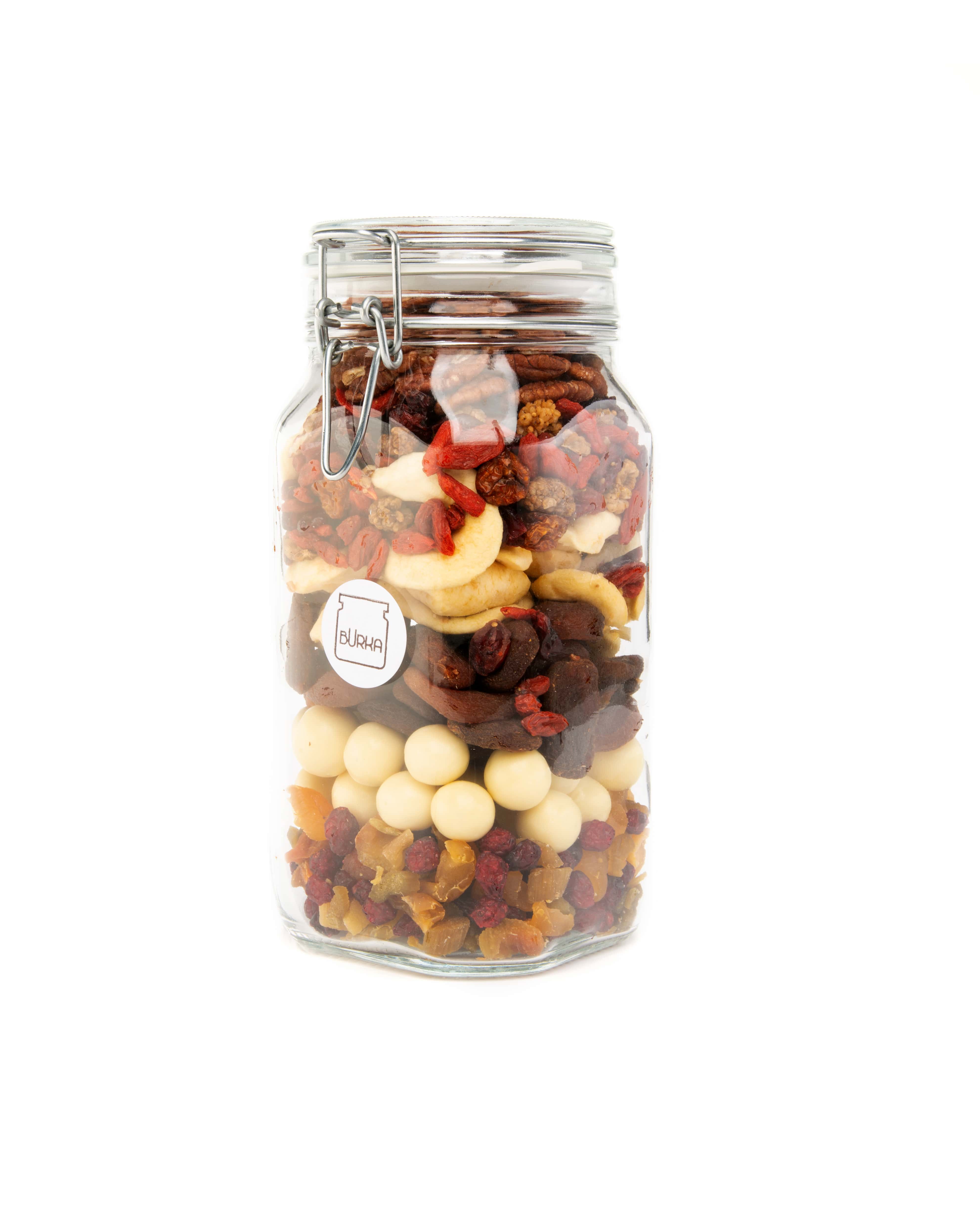 Hermētiska dāvanu burka, kuras sastāvā ir rieksti, žāvētas ogas un augļi.