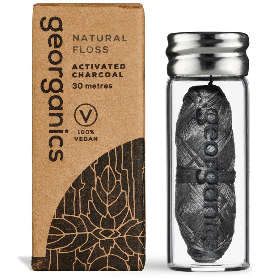 Georganics zobu diegs ar piparmētru un aktivēto ogli stikla pudelītē